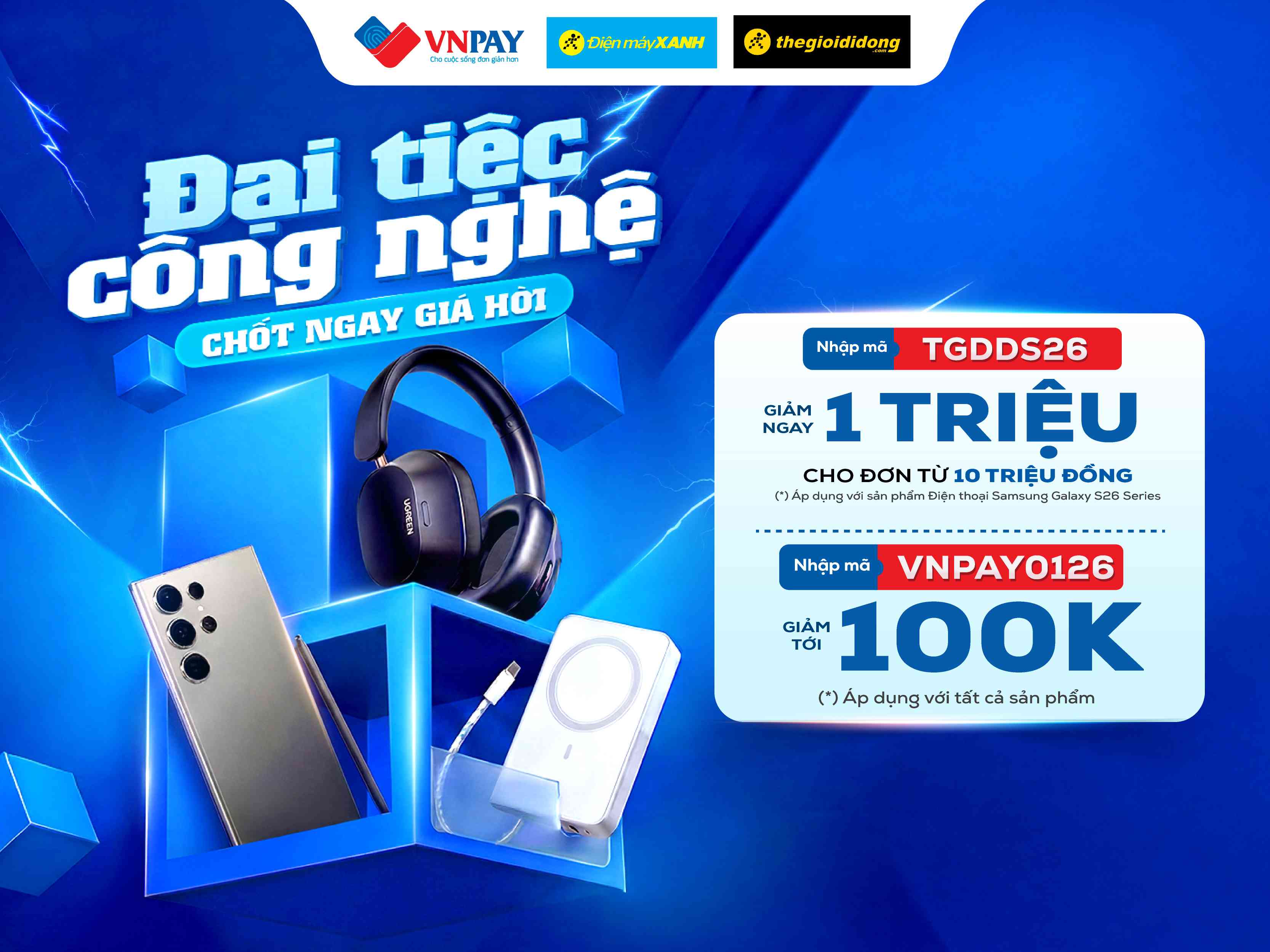 Từ nay đến hết 31/05/2026, khi thanh toán VNPAY-QR trên ứng dụng ngân hàng hoặc ứng dụng VNPAY tại hệ thống cửa hàng Thế Giới Di Động, Điện máy XANH và các website thegioididong.com, dienmayxanh.com, bạn sẽ có cơ hội nhận ngay ưu đãi giảm giá lên đến 1 triệu đồng. Chi tiết như sau: